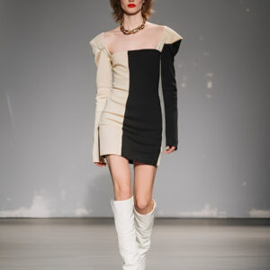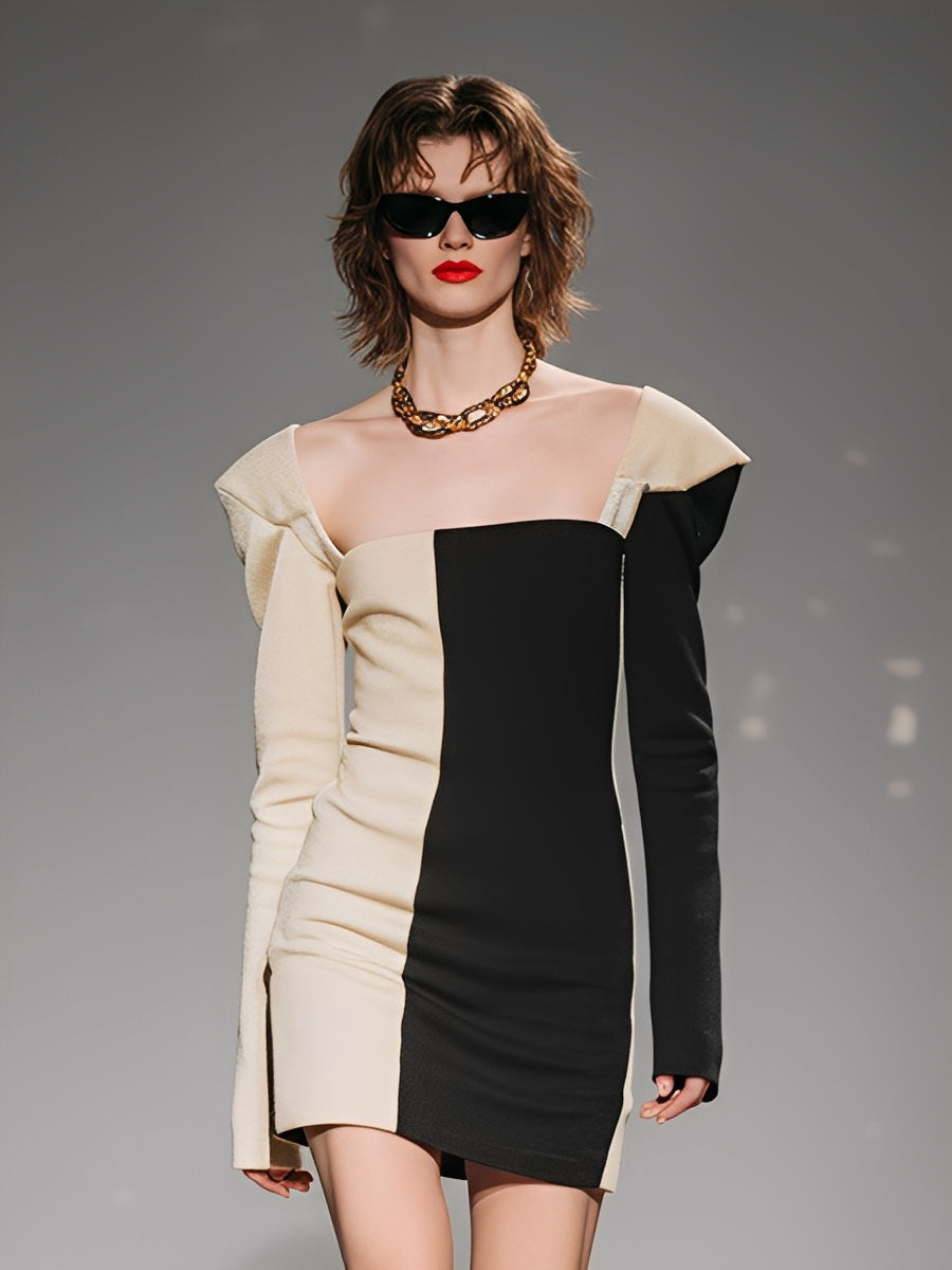 A color-block knitted mini dress with structured shoulders. It delivers a bold, modern statement look for parties or stylish nights out.