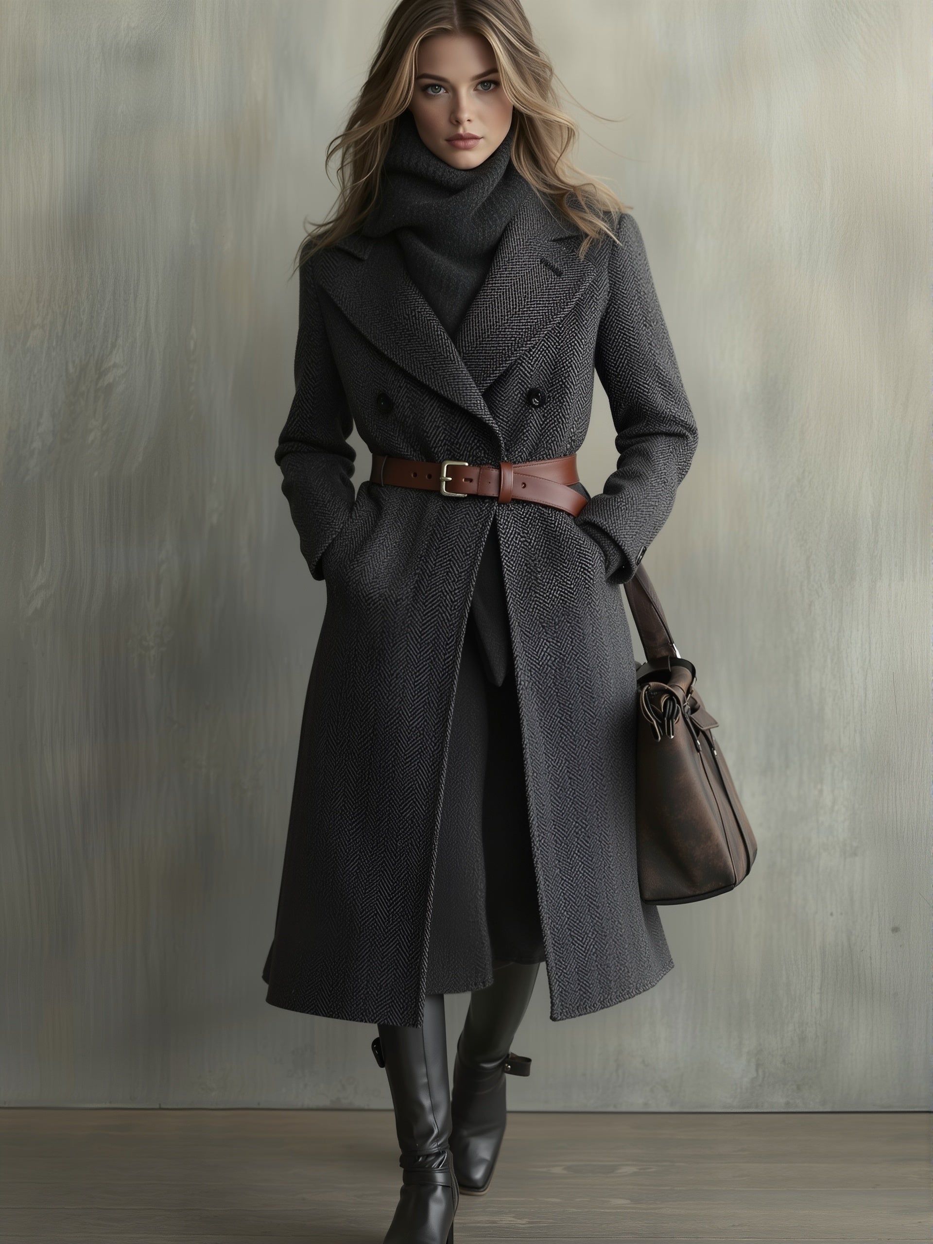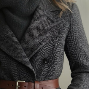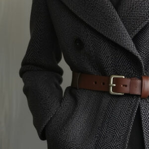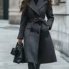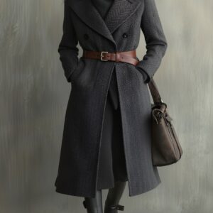 A chic and sophisticated double-breasted coat featuring a refined subtle pattern and a contrasting color belt that adds a modern touch. This elegant outerwear piece combines classic tailoring with contemporary design, offering both warmth and style for cooler seasons.