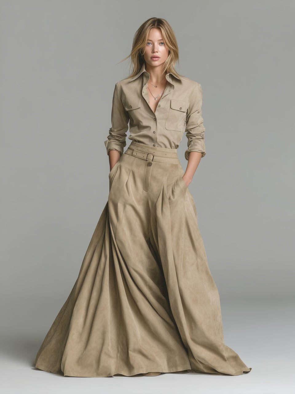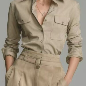 A sophisticated and feminine ensemble that combines a romantic blouse with a high-waisted skirt for an elegant, flattering look. The blouse features delicate details, while the skirt accentuates the waist, making this suit perfect for both professional and semi-formal occasions.