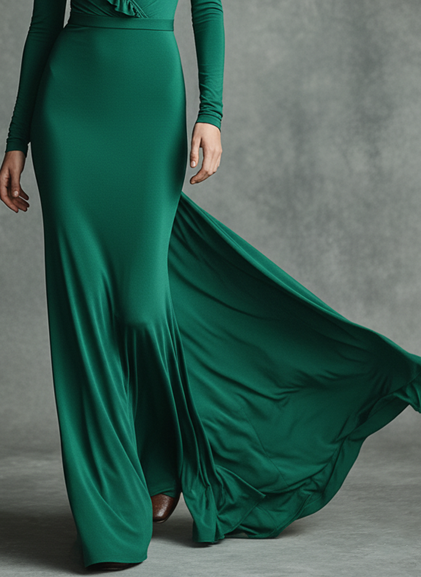 A slim-fit maxi dress featuring a ruffled V-neckline and long sleeves, designed to exude elegance and feminine charm for any special occasion.